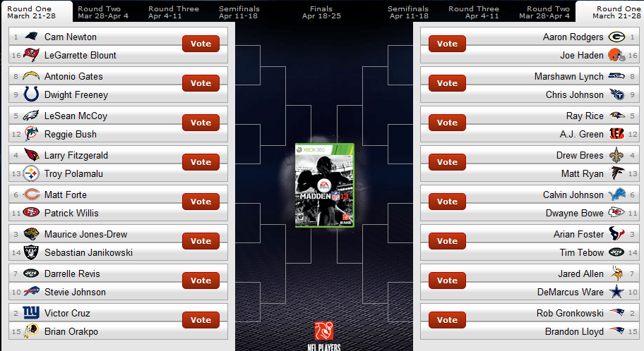 It’s not all that often that we talk about the prospects of a tight end being on the Madden cover, but there is no doubt that Rob Gronkowski (Odds To Be On Madden Cover: 6 to 1 @ Bovada Sportsbook) is going to be a man that takes deep run into this tournament. Gronk is another one of these figures that really came out on nowhere to be a force this year, and he is in a bracket that just isn’t all that hard when push comes to shove. There shouldn’t be a player challenge him until Round 3, where the likes of Arian Foster or Calvin Johnson could be waiting. Remember that Gronk also has the Boston market on his side, and though playing with the New England Patriots does turn off a ton of fans, it also helps get the support of his own huge market.