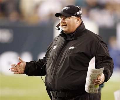 Philadelphia Eagles HC Andy Reid, who looks angrier than ever about the fact that his franchise quarterback, Donovan McNabb was traded for peanuts in his own division.